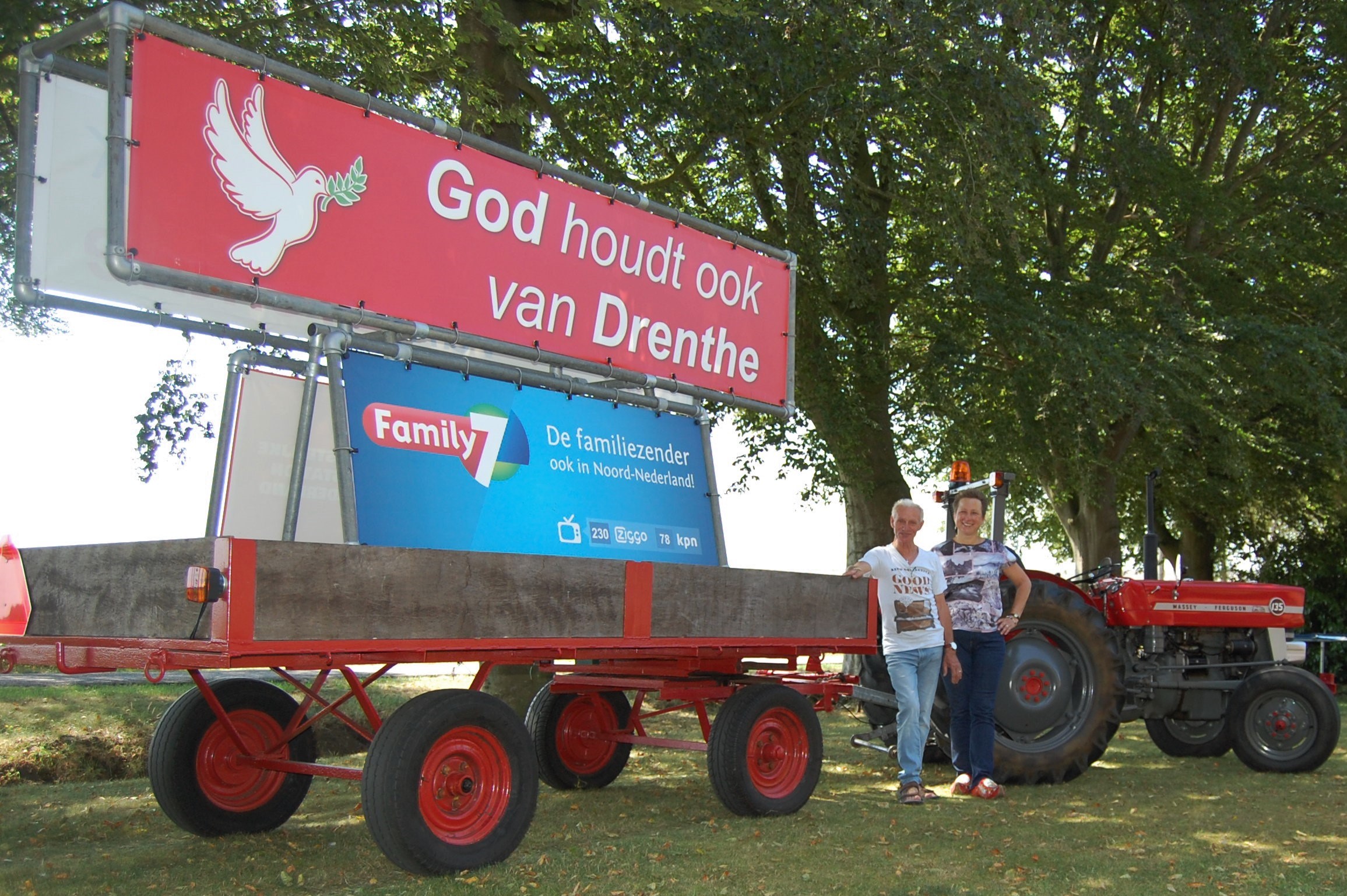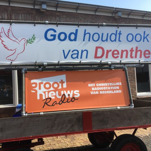 In 2017 zijn we begonnen, ontwerp voor de spandoeken, kar kopen, de trekker was er al. Frame bouwen, spandoeken eraan, en gaan! De eerste actie was het ontvangen van Groot Nieuws Radio, daarna het onthullen van de trekker bij de kerk.